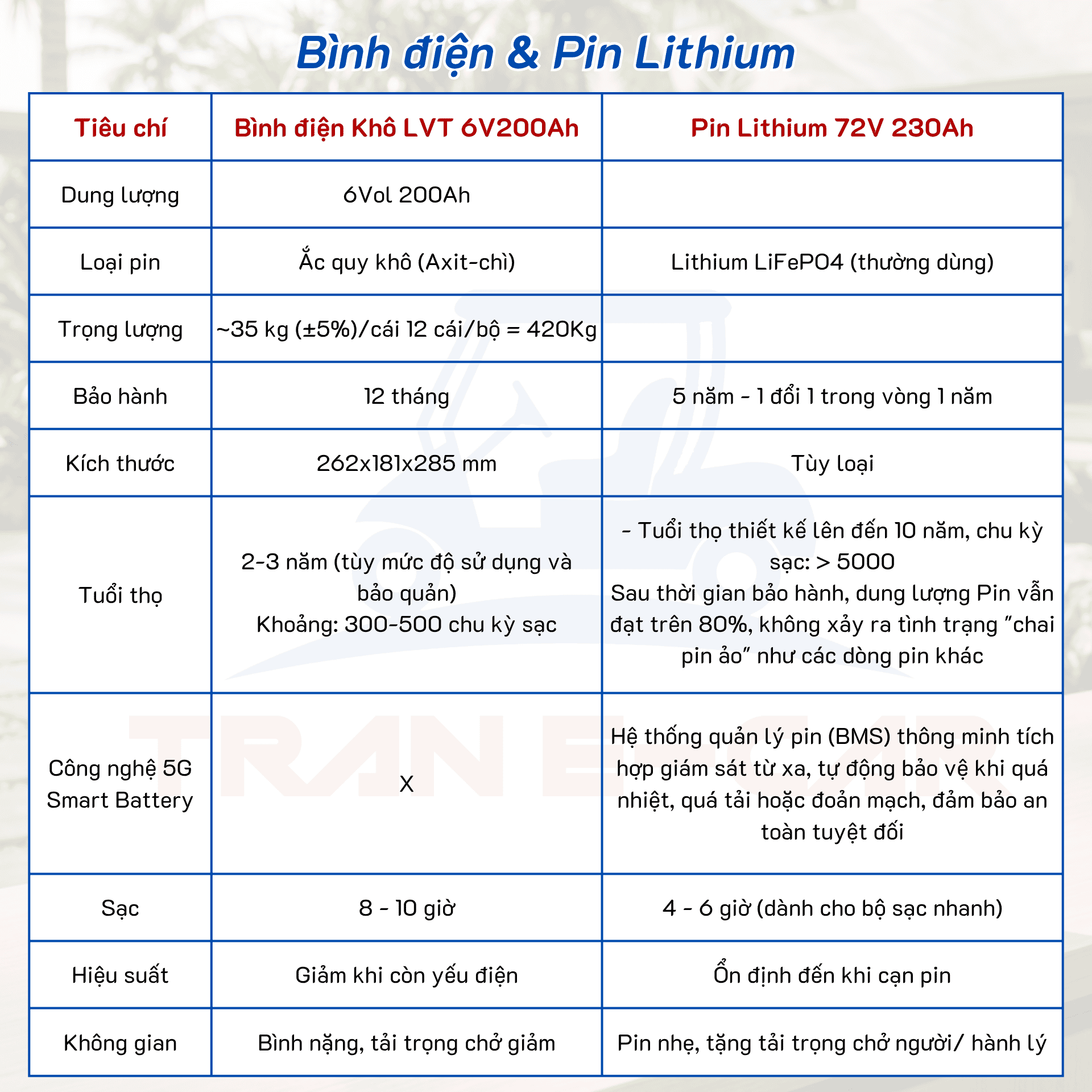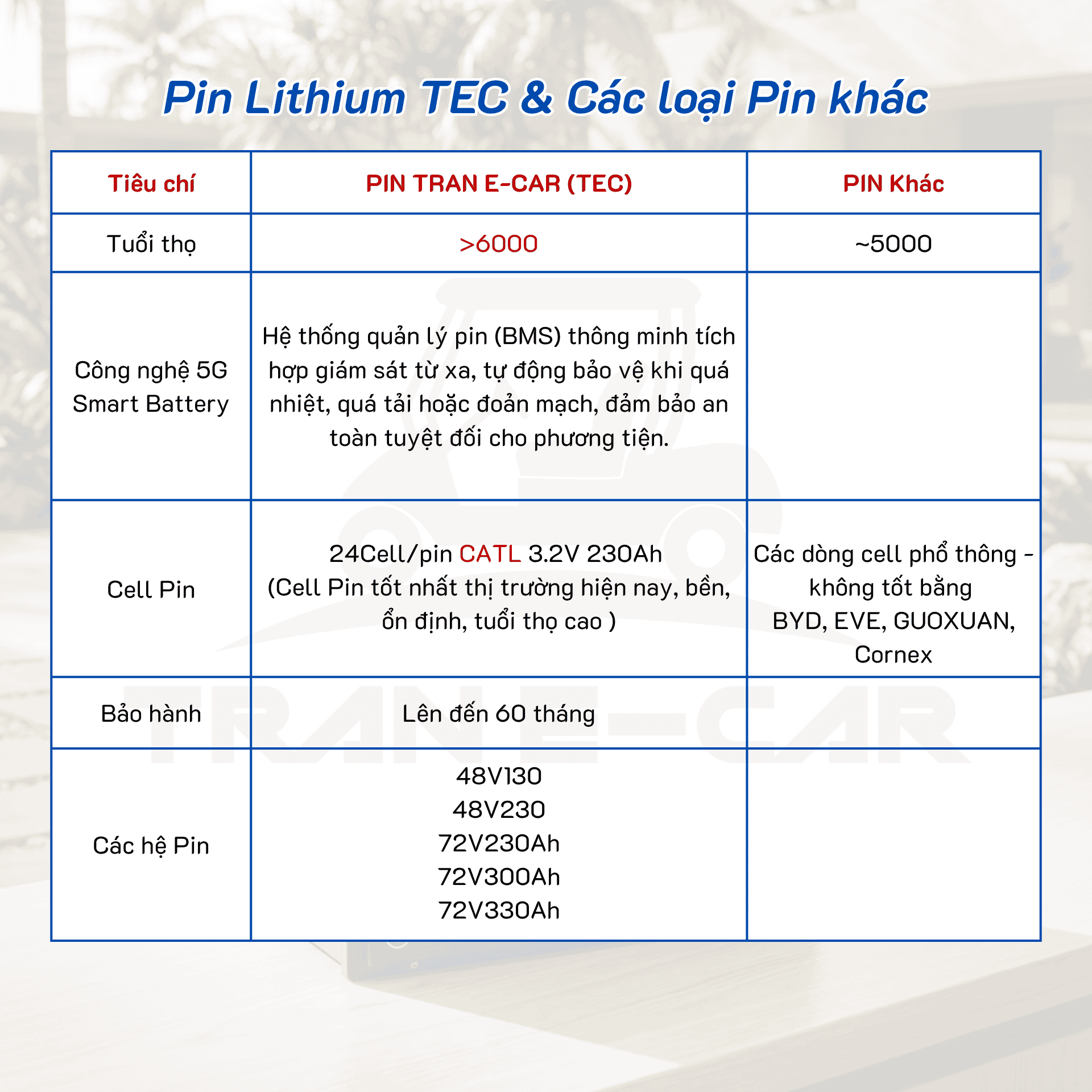 Pin là thành phần quan trọng ảnh hưởng trực tiếp đến hiệu quả khai thác xe điện. Lựa chọn đúng loại pin ngay từ đầu sẽ giúp doanh nghiệp tối ưu chi phí, nâng cao hiệu suất và duy trì sự ổn định trong vận hành. Tran E-Car tập trung cung cấp các giải pháp pin Lithium chất lượng cao, hướng đến hiệu quả sử dụng bền vững và phù hợp với từng nhu cầu cụ thể của khách hàng.